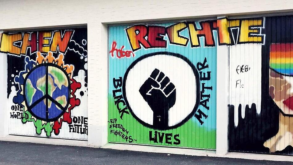 Die Graffitikünstlerin, Pädagogin und Linguistin Sonja Panzer gestaltete zusammen mit Jugendlichen unter dem Motto "Jetzt wird's bunt" ein großes und buntes Bild zum Thema Menschenrechte. Durch ein beeindruckendes Graffiti sind die verunstalteten Garagen zu einem echten Blickfang geworden.