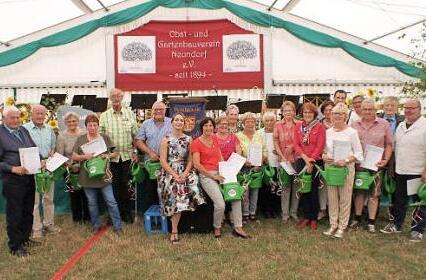 Der Obst- und Gartenbauverein (OGV) Neundorf feierte am Wochenende sein 125-jähriges Bestehen mit einem Kommersabend. Eine ganze Reihe der 143 Mitglieder konnte am Festsonntagnachmittag anlässlich der Jubiläumsfeierlichkeiten für eine langjährige Mitgliedschaft geehrt werden. Die Blaskapelle Neundorf untermalte die gemütliche Atmosphäre im Festzelt mit flotter Musik. So erhielten die Ehrennadel in Silber für eine 25- bis 40-jährige Mitgliedschaft Herbert Bergmann, Brigitte Dück, Elisabeth Gehrlicher, Anneliese Helmprobst, Anni Helmprobst, Andrea Herr, Harald Kempinski, Sieglinde Klüglein, Sebastian Kunzelmann, Hermann Lankl, Erika Linke, Monika Lossner, Raimund Lossner, Edith Neumer, Peter Neumer, Ulrike Neumer, Guido Rampel, Rita Rampel, Günther Schuster, Winfried Trinkerl, Werner Zapf, Christine Zapf, Helga Angermüller, Werner Angermüller, Rosa Brückner, Gertrud Carl, Karin Dünisch, Roland Dünisch, Josef Falk, Rudi Gehrlicher, Gerda Haake, Anni Linke, Klemens Linke, Walli Rampel, Hans Rößner, Walter Trinkerl, Renate Zeitner und Loni Zimmer.