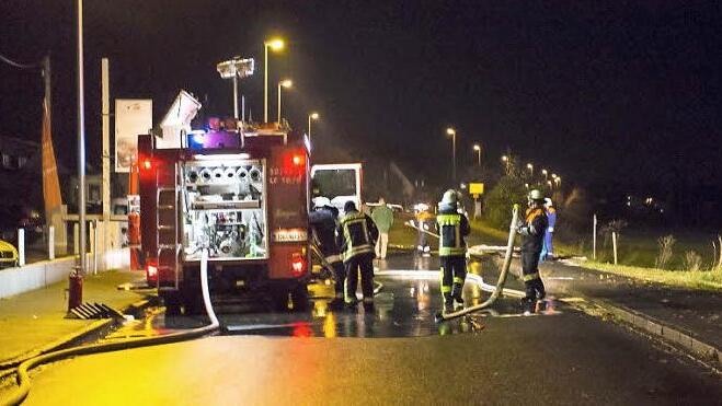 In der Niederndorfer Hauptstraße hat am Montagabend gegen 18.40 Uhr ein 52-jähriger BMW-Fahrer Rauch aus dem Fußraum seines Wagens bemerkt. Unmittelbar nachdem er am Fahrbahnrand anhielt, fing das Fahrzeug in diesem Bereich Feuer und wenige Minuten später, als die Feuerwehr eintraf, stand das Gefährt bereits in Vollbrand. Die Ursache wird in einem technischen Defekt vermutet. Den Sachschaden am Fahrzeug und an der beschädigten Teerdecke schätzt die Polizei in ihrem Pressebericht auf insgesamt fast 5000 Euro. Der Fahrer selbst kam mit dem Schrecken davon. Foto: Andreas Brandl