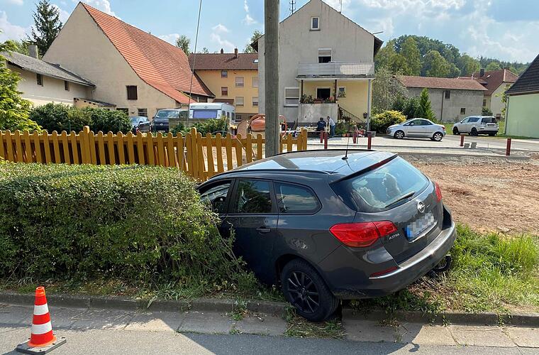Die Fahrerin durchquerte die Ortsdurchfahrt, als ein Mann mit seinem Radlader aus einer Baustelle herausfuhr. Die Frau kam daraufhin von der Fahrbahn ab, fuhr durch eine Hecke und riss die Sicherungsseile eines Holzstrommasten mit sich. Das Fahrzeug kam über einem Bachlauf zum Stehen. Der Gesamtsachschaden beläuft sich ersten Angaben zufolge auf circa 10 000 Euro. red