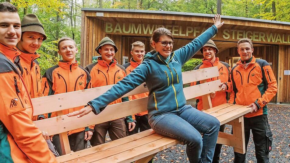 Mit einem ganzen Anhänger voller Bänke fuhren die angehenden Forstwirte und ihr Ausbilder kürzlich nach Ebrach und statteten die Spazierwege rund um die Attraktion im Wald mit Sitzgelegenheiten aus. So können die Besucher den bunten Laubwald im Steigerwald künftig ganz entspannt genießen.