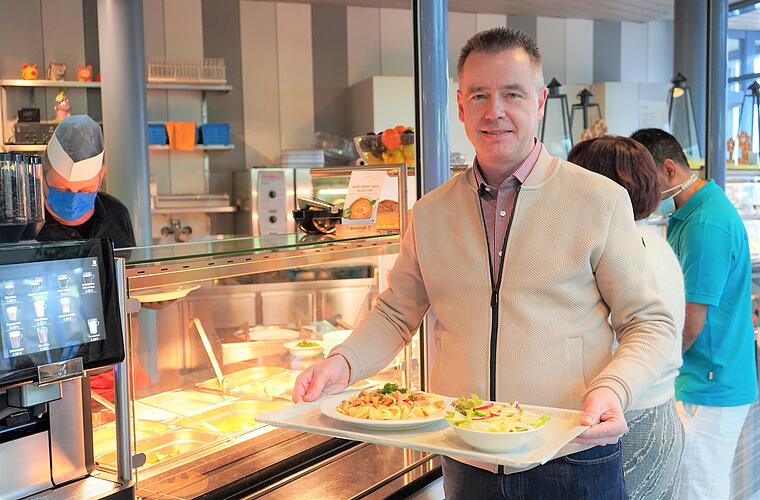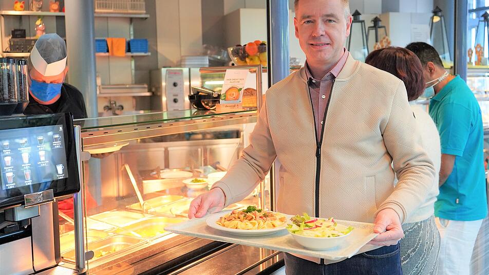 Kurdirektor Thomas Beck ist etwa einmal pro Woche im Palmenbistro der Hescuro Klinik Bad Bocklet anzutreffen. „Wenn es die Termine zulassen, gehe ich hierher zum Mittagessen “, erzählt er. Diesmal wartete eine besondere Überraschung auf ihn, die Mitarbeitenden der Klinik und alle anderen, die ihre Mittagspause im Palmenbistro verbringen. Statt des üblichen Tagestipps wurde auf dem Speiseplan „Heimatteller Bayerisches Gaumenkino – Deftiges Geschnetzeltes vom bayerischen Strohschwein mit Weißwein und Champignons verfeinert dazu Orecchette-Nudeln und Salat aus der Region“ angekündigt. Das klingt gut, dachten sich viele, und griffen zu. So auch Thomas Beck .