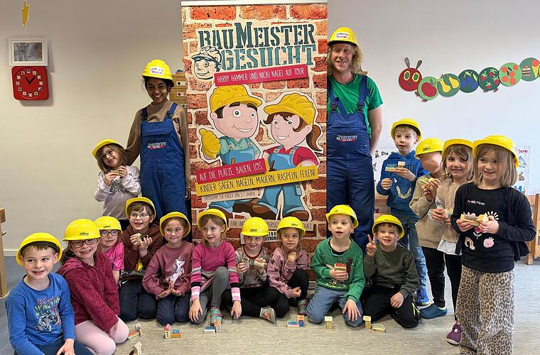 Gemeinsam mit den Erzieherinnen führten sie 16 Kinder im Vorschulalter behutsam und spielerisch an erste handwerkliche Tätigkeiten heran. Als Patenbetrieb begleitete das Bauunternehmen Stolz aus Untererthal das Projekt vor Ort und unterstützte die Aktion aktiv.