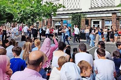 Den fulminanten Abschluss der Projektwoche bildete das Schulfest am Freitagnachmittag, das trotz wechselhafter Wetterprognose im Freien auf dem Pausenhof stattfand. Nach einer gelungenen Generalprobe am Morgen hieß es am Nachmittag Bühne frei für die Tanzaufführungen sowie die Präsentation der betrieblichen Lernaufgabe.