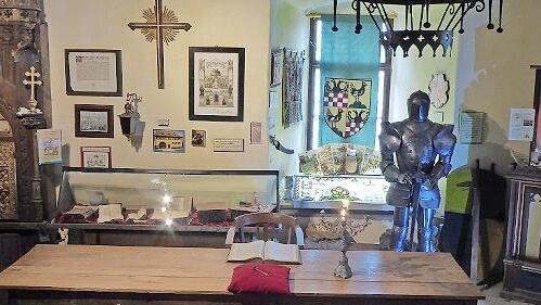 Diese Ritterkapelle ist bei der Museumsreise auch ein zentraler Ort in der 500-jährigen Geschichte des Schlosses, in dem Glaube und Krieg noch gegenwärtig sind. Da hatte doch tatsächlich einst ein in Poppenlauer einquartierter napoleonischer Soldat in dem heute ausgestellten alten „Kirchenbuch“ geblättert. Und da zu jener Zeit die Kirche an ihrer Glaubhaftigkeit eingebüßt hatte, hat jener berittene Jäger auf Französisch dort hineingeschrieben: „Alle Leute, die hier lesen, werden nichts als Dummheiten finden.“ Jedoch sehen sie dort selbst, da hat ein Weiterer mit zarter Hand daruntergeschrieben: „Der Heiland ist noch.“