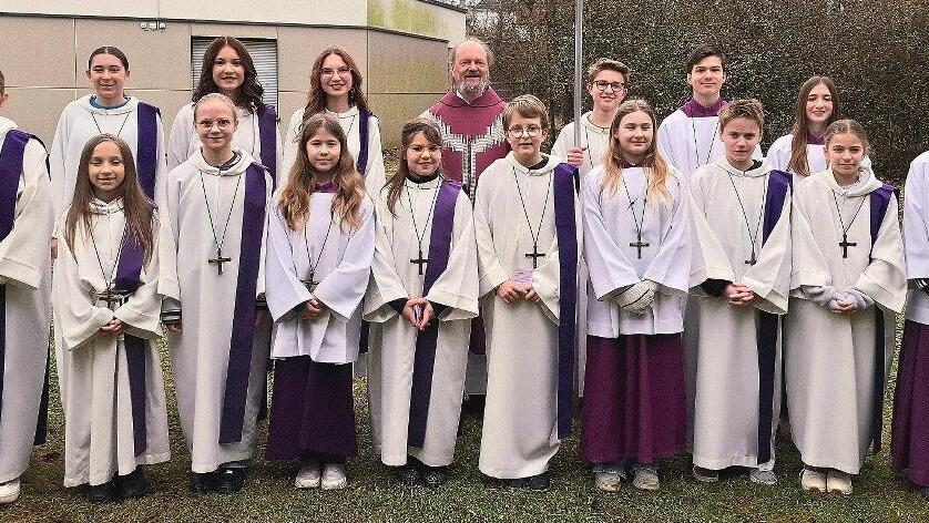 Neben der Einführung galt es auch Abschied zu nehmen: Ministrant Benedikt Keller wurde offiziell verabschiedet. Die Ausbildung der neuen Ministranten umfasste insgesamt acht Stunden und wurde von Oberministrantin Kyra Scheit übernommen. Unterstützt wurde sie dabei zeitweise von weiteren Ministranten, da ein „Team“ in der Regel aus sechs Personen besteht. Besonders hilfreich stand ihr auch Benedikt Behl zur Seite, der mit einem Augenzwinkern erzählte: „Auf diese Weise konnte ich sogar mehrfach Pfarrer spielen – das war echt cool.“