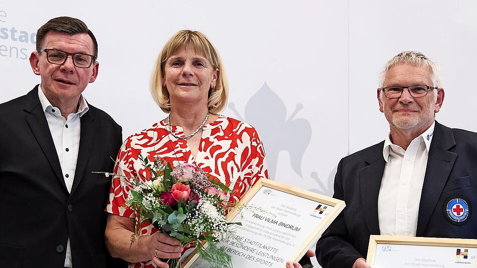 Die Stadtplakette für besondere Leistungen im Bereich Sport erhielten Vilma Bindrum (sie engagierte sich außerordentlich für die Volleyballabteilung des TV/DJK Hammelburg) und Peter Gößmann-Schmitt (er engagierte sich außerordentlich für die Wasserwacht, Ortsgruppe Hammelburg).