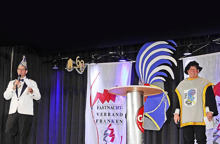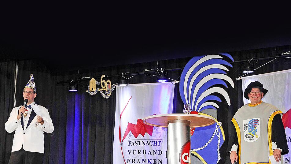 Ordensverleihung des Fastnacht-Verbandes Franken in Hammelburg: Sebastian Kleinhenz (1. Vorsitzender HA-KA-GE 1960 e.V.) und Markus Daum (Hammelburger Herold) begrüßten die fördernden Mitglieder aus ganz Unterfranken.