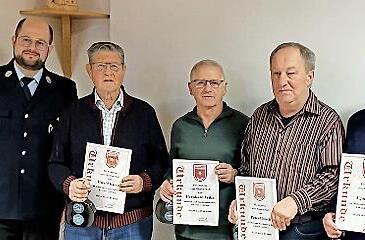 Für langjährige Vereinstreue wurden Peter Bötsch für 50 Jahre, Bernd Wilm für 55, Egon Hehn für 60 und Ewald Kiesel für 65 Jahre geehrt. Befördert wurden Eva Kiesel zur Oberfeuerwehrfrau, Matteo Scholz und Simon Tischler zum Oberfeuerwehrmann.