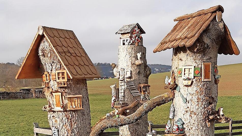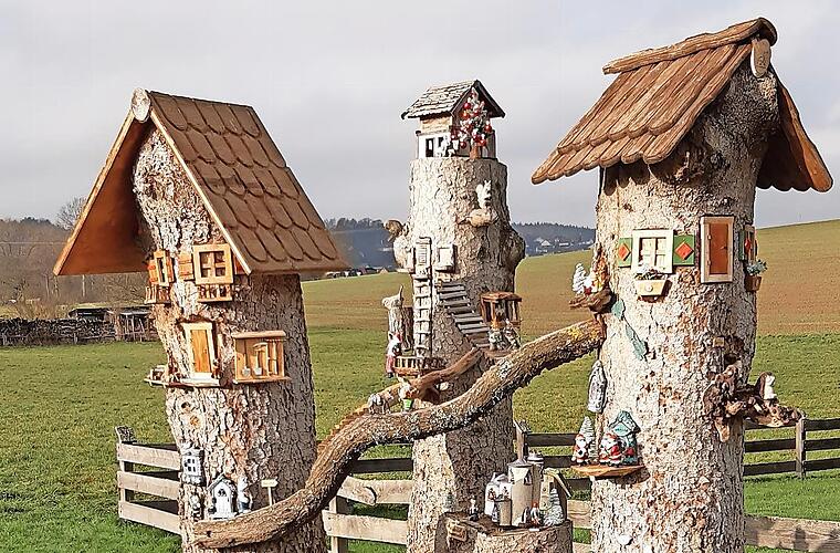 Daher entschied man, etwa drei Meter hohe Stümpfe stehen zu lassen. Die verbliebenen Stämme wurden dann in liebevoller Handarbeit zu Zwergen- und Gnomenbäumen umgestaltet.