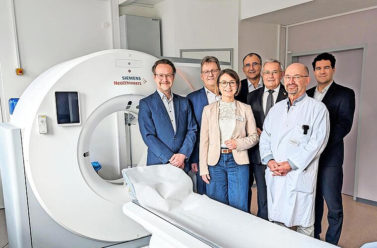 Dr. Dominik Morhard, Jürgen Oswald, Stefanie Dörfner, Jürgen Winter, Stefan Funk (Bezirkstagspräsident), Dr. med. Bernd Seese und Sebastian Güldner freuen sich über den neuen Computertomographen und die Zusammenarbeit.
