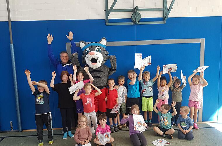 Große Augen machten die Kinder, als „Balatu“, das Maskottchen des Bayerischen Turnverbands, den fleißigen Kindern ihr Turnabzeichen überreichte.
