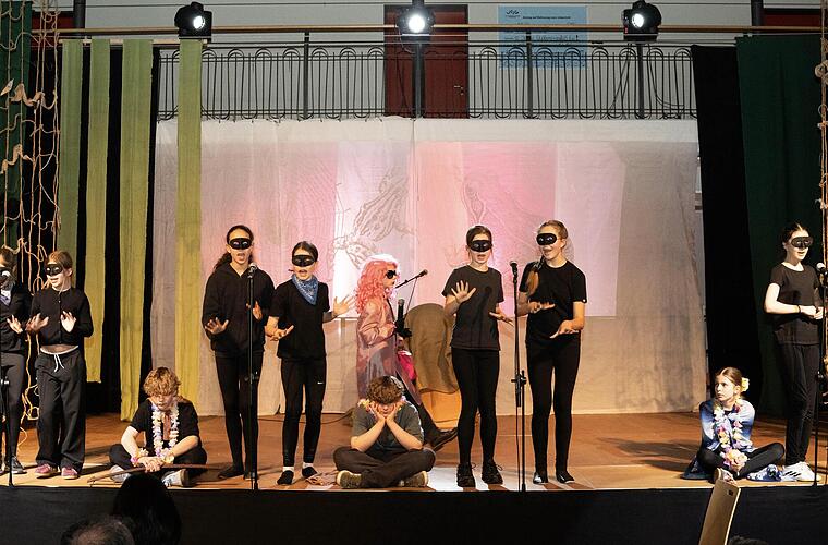 Grüne Tücher, ein rätselhaftes Netz und farbenfrohe Projektionen ließen auf der Bühne in der Aula des Jack-Steinberger-Gymnasiums (JSG) einen Dschungel entstehen, in dem alle Beteiligten ihr Abenteuer erlebten. Zum einen das aus dem Musical „Insel der Falken“ von O. Zahn, S. Stürmer und J. Junker, in dem Kinder selbstbestimmt auf einer Insel leben. Eine geheimnisvolle Kraft lässt sie seit 500 Jahren nicht altern. Mutig verteidigen sie ihre Insel gegen eine Kosmetikfirma und ihre skrupellose Geschäftsführerin. Sie geraten aber in eine fatale Falle, aus der ihnen ihr Zusammenhalt und die Freundschaft verantwortungsvoller Erwachsener heraushilft. Alle Rollen spielten die Theaterkinder selbst, voller Elan und überzeugend in ihrem Auftreten.