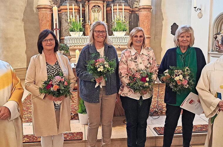 Renate Stolz war sogar 24 Jahre ununterbrochen dabei. Ihr wurde als Dank die Urkunde mit Ehrennadel des Bistums Würzburg überreicht. Diakon Manfred Müller bedankte sich zudem bei ihr, dass sie auch nach ihrem offiziellen Ausscheiden, weiterhin die Geburtstagsgratulationen der Pfarrgemeinde an die Jubilare überbringt. Diese stünden im Schnitt jede Woche an. Der Dank der Pfarrgemeinde gilt auch Beate Brunner, welche seit 2014 wieder den Pfarrbrief sowie zuletzt die Pfarrbriefbeilage der Gemeinde für den gemeinsamen Pfarrbrief des pastoralen Raumes entwarf und diese Tätigkeit nun in andere Hände gibt.