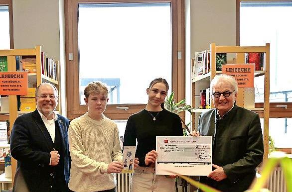 OStD Markus Arneth (links) überreicht den Spendenscheck an Stefan Labus (rechts). Mit dabei die Schülersprecher Sarah Freitag und Jannik Christ.