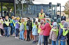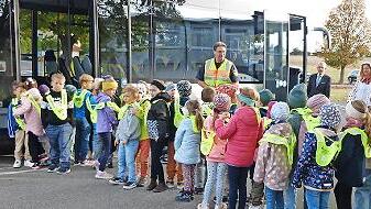 Für das Training stellte das Busunternehmen Borst extra einen Schulbus samt Fahrerin zur Verfügung. So konnten die Grundschüler direkt das sichere Verhalten an der Haltestelle und im Bus üben: Etwa, dem Bus nicht entgegenzulaufen, sondern warten, bis er angehalten hat. Im Bus sitzen oder stehen bleiben und nicht herumtoben. Mit dem Aussteigen warten, bis der Bus angehalten hat und dann erst aufstehen sowie ohne zu drängeln und zu schubsen aussteigen. Nach dem Aussteigen warten, bis der Bus weitergefahren ist und erst dann die Straße überqueren.