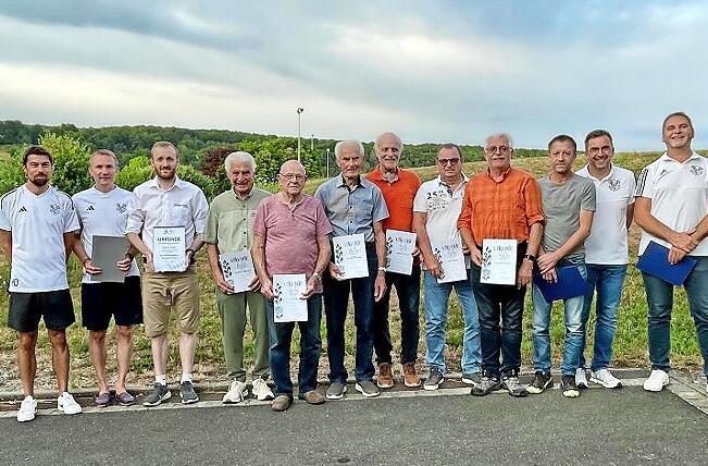 Die geehrten anwesenden Personen mit ihren Urkunden sowie dem 1. Vorsitzenden Marco Danz und Ehrenamtsbeauftragtem Jürgen Stumpf.