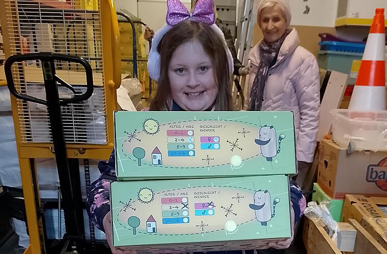 Kate, Enkelin der ehrenamtlichen Helferin Ines Stofledt, hat mit einem strahlenden Lächeln und voller Begeisterung die Boxen an die Kinder überreicht – ein echter Freudenmoment für alle.