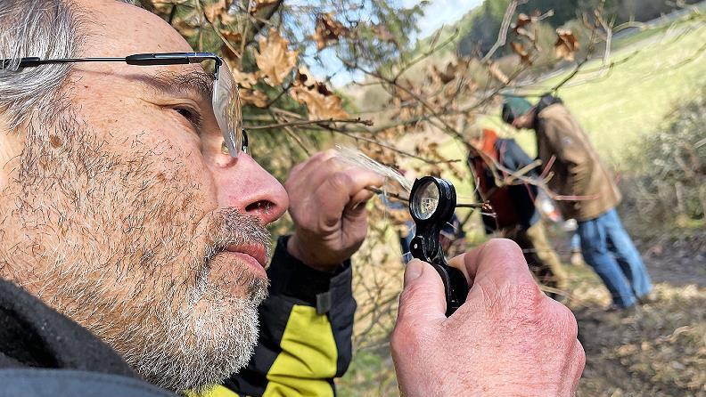 Für die Exkursion hatte Schmucker in minutiöser stundenlanger Vorbereitung unterwegs mit der Lupe die Fundorte markiert. Denn mit bloßem Auge ist da für den Laien wenig zu sehen, heißt es in einer Pressemitteilung des Bundes Naturschutz.