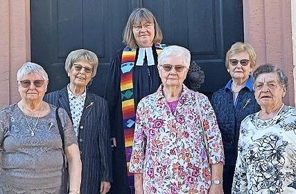 Steinerne Konfirmation feierten (von links) Christa Günther geb. Vornwald, Christa Eberhardt geb. Henning, Hannelore Mühlig geb. Christiner und Elfriede Herold geb.Höfler, sowie Pfarrerin Barbara Weichert.