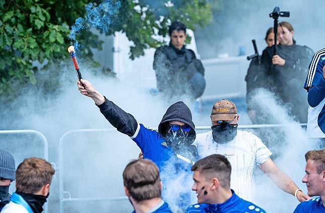 Ausnahmezustand am Bahnhof in Ebenhausen: Rund 200 Polizisten stehen vor dem kleinen Bahnhof des Oerlenbacher Ortsteils und positionieren sich. Die Türen einer Regionalbahn öffnen sich, rund 80 Fußballanhänger – gekleidet in blau-schwarzer, szenetypischer Fanbekleidung – steigen aus dem Zug auf Gleis 3 aus. Die erste Pyrotechnik wird gezündet, Fangesänge ertönen lautstark, die Derby-Atmosphäre ist aufgeheizt, und die Fans wollen nur eines – hin zum Spiel, ins Stadion und ihre Mannschaft unterstützen.
