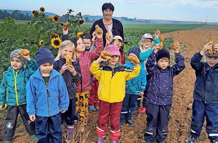 Die Kinder hörten wissbegierig zu, als ihnen die Bäuerin einiges über die Kartoffel erzählte. Natürlich waren sie für die Ernte ausgerüstet und rückten mit Schaufeln, Eimer und Schubkarre aus. Auch mit den bloßen Händen machten sie sich auf die Suche nach den beliebten Knollen. Jeder wollte die größte Kartoffel erwischen und am Ende zum Kartoffelkönig gekrönt werden.