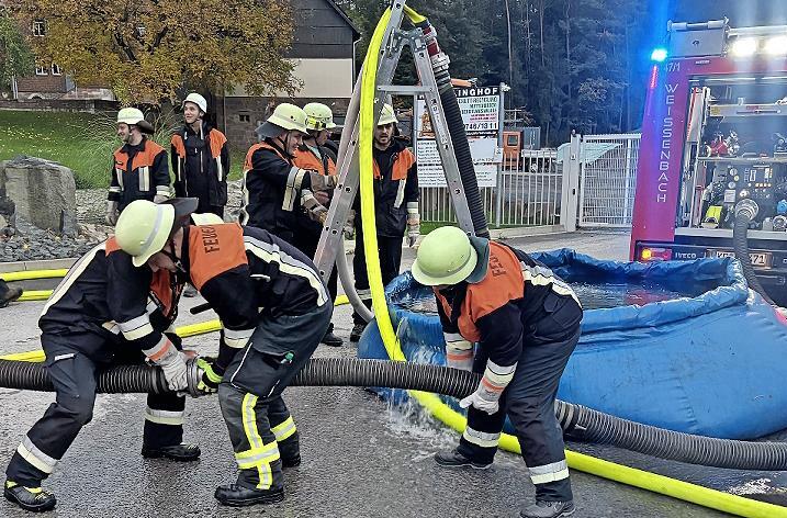 Bis die Schlauchleitungen einsatzbereit waren, übernahm das Tanklöschfahrzeug der Feuerwehr Bad Brückenau zunächst die Wasserversorgung an der angenommenen Brandstelle und füllte den Faltbehälter. Anschließend wurde mit zwei Pumpen eine hohe Wasserabnahme simuliert, um die Leistungsfähigkeit der Förderstrecken zu testen.