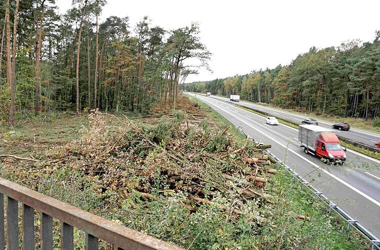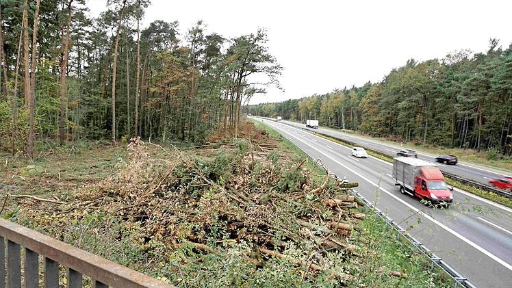 Die derzeit laufenden Rodungen an der A 3 bei Klebheim haben nichts mit der geplanten PWC-Anlage zu tun, wie teils von Anwohnern befürchtet. Die Autobahndirektion schafft Platz für den sechsstreifigen Ausbau der A 3 zwischen Schlüsselfeld und Erlangen. Dieser Ausbau soll im Jahr 2019 beginnen und die Gehölze rechts und links der Trassen werden jetzt schon abgeholzt. Während der Abholzarbeiten wird der Standstreifen immer wieder abgesperrt, die beiden Fahrspuren sind davon nicht betroffen. Foto: Richard Sänger