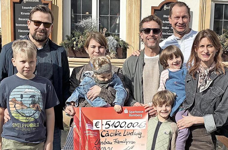 Die Familie Ludwig-Podewski mit Cäcilie nahm den Scheck entgegen; mit auf dem Bild sind die Familie Feldner mit Karina von Premiumpartner Friseur Scharf sowie Christian, der spätestens mit seinem Song „Hallo Bamberg“ Kultstatus erreicht hat, und K...