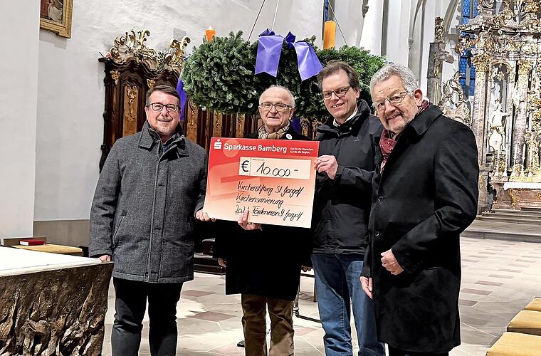 Ein festliches Konzert mit Orgel und Trompeten in der Gangolfkirche bildete den Jahresabschluss der diesjährigen Veranstaltungen des Fördervereins St. Gangolf, der zu diesem Anlass einen Förderscheck über 10.000 Euro an Pfarrer Marcus Wolf und Kirchenpfleger Dr. Winfried Strauch für die Gemeindearbeit überreichen konnte. Den musikalischen Teil bestritt Lothar Mayer, ehrenamtlicher Hauptorganist der Kirche, mit den Trompetern Andres Nick und Dirk Schaffranski. Der reizvolle Kontrast von Werken des Frühbarocks und der Gegenwart verzauberte die zahlreichen Zuhörer, die auch diesmal wieder mit ihrer Spendenbereitschaft zur Schuldentilgung aus der Kirchengeneralsanierung beitrugen, wie Alexander Karmann, Vorsitzender des Fördervereins, zu Programmende erfreut feststellte. Roland Weißhaupt vom Förderverein ergänzte, dass neue Herausforderungen wie die Renovierung des Jugendheims den künftigen Schwerpunkt der Förderaktivitäten bilden werden. red