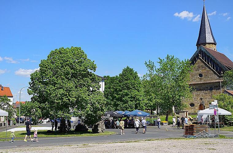 Der Landtagsabgeordnete Holger Dremel ( CSU ) erläuterte einiges zur Städtebauförderung und berichtete, dass aktuell rund 75 Prozent der verfügbaren Mittel für den ländlichen Raum aufgewendet werden. Nach der Segnung machten sich zahlreiche interessierte Bürger zusammen mit der Bürgermeisterin, Holger Dremel und Landrat Johann Kalb auf den Weg Richtung „Zentrum“. Dort wurde ebenfalls mit Mitteln aus der Städtebauförderung eine Begegnungsstätte geschaffen, zudem wurde viel Fläche entsiegelt. Der Spaziergang führte weiter zur Endstation, dem Baustellenfest in der Ortsmitte. Hier hat Breitengüßbach ab September richtig viel vor. Anhand der Pläne der Berliner Architekten Grieger & Harzer, die vor drei Jahren einen entsprechenden Wettbewerb gewonnen hatten, wird der Bereich mit Festplatz und Kirchenumfeld komplett neu gestaltet.