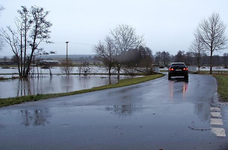 Schneeschmelze und Regen sorgten auch im Tal der Rauhen Ebrach für Überschwemmungen . Die Wiesen von Burgebrach bis Pettstadt standen am Wochenende unter Wasser . Die Wege und Straßen von Stappenbach nach Ober- und Unterharnsbach waren überflutet und mussten gesperrt werden, nur der überhöhte Fußweg war gerade noch passierbar. Da der Radweg Richtung Ebrach auf der früheren Bahntrasse verläuft und diese höher liegt, konnte er befahren werden, während links und rechts eine große Seenplatte lag. Diese aber war interessant für viele Zugvögel, die anscheinend schon wieder auf dem Rückweg sind. Auch die zwei Störche von Unterneuses, die ebenso wie die von Steppach und Stolzenroth den Weg nach Süden nicht angetreten hatten und hier überwinterten, suchten Futter. Intelligenterweise wateten sie genau an der Linie zwischen Wasser und Land, da sie hier die Mäuse und andere Tiere fanden, die sich vor dem Wasser noch an Land gerettet hatten. Im Bild die Straße zwischen Stappenbach und Unterharnsbach, die wegen Überflutung gesperrt war. Foto: Joseph Beck