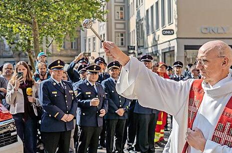 Zahlreiche Angehörige der Feuerwehr, Vertreter der Stadt sowie viele interessierte Passanten hatten sich vor der Kirche St. Martin eingefunden, um an der Segnung von sechs neuen Fahrzeugen der Feuerwehr teilzunehmen, heißt es in einer Pressemitteilung der Stadt.