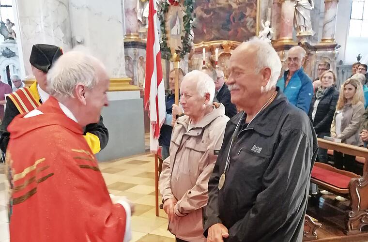 Bei der 49. Männerwallfahrt von Reckendorf nach Vierzehnheiligen haben Pater Maximilian und Wallfahrtsführer Enrico Gruber Manfred Ellner und Helmut Koleve für ihre 40. Teilnahme mit der goldenen Wallfahrermedaille ausgezeichnet.