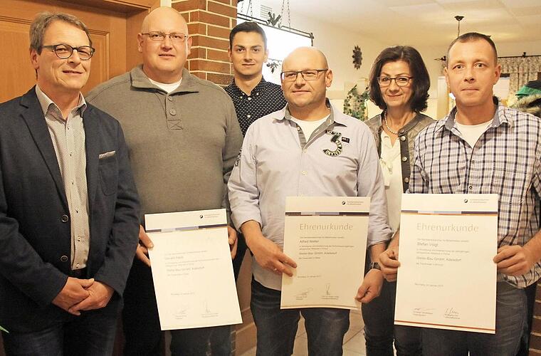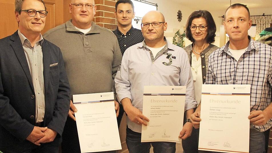In Adelsdorf sind am Wochenende Mitarbeiter des Bauunternehmens Weller-Bau für ihre Firmentreue geehrt worden. Stefan Voigt erhielt für 15 Jahre, Gerald Hack für 25 Jahre und Alfred Weller für 30 Jahre Betriebszugehörigkeit eine Ehrenurkunde sowie eine Anstecknadel der Handwerkskammer Mittelfranken und ein Geschenk aus den Händen des Chefs Karl-Heinz Weller.