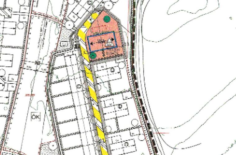 Jetzt wurde ein Bauantrag für das Vorhaben gestellt, der die gleichen Befreiungsanträge enthält; die eingereichte Planung weicht nur geringfügig von den zum Vorbescheid vorgelegten Unterlagen ab: Es soll kein Carport errichtet werden, sondern ein Stellplatz. Die Garage wird einen Meter weiter nach Süden und wenige Zentimeter nach Westen verlegt und die Hauseingangstür soll ein kleines Vordach erhalten. Außerdem ist eine Umrandung mit Steinblöcken knapp einem halben Meter im Süden und Westen der Gebäude eingezeichnet, die ein Abrutschen des Erdreichs verhindern soll.