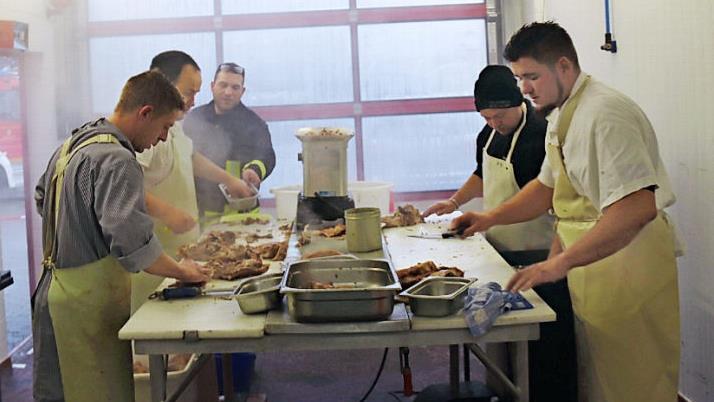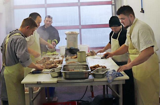 In Adelsdorfs Feuerwehrzentrum waren bereits ab 5.30 Uhr die beiden Kesselmeister Hans Mönius und Sebastian Hörrlein mit ihren jungen Assistenten Julius und Frederik Petersilka im Einsatz. "Sieben Bäuch', 95 Köpf', 40 Zungen, 40 Herzen, 40 Nieren, 150 Blut- und 300 Leberwürscht sind es", berichtete Metzger Gerald Glotz, der zusammen mit seinem Kollegen Dominik Müller und den Helfern Jürgen Hörrlein und Thomas Hänsel eifrig am Schneiden war. Stolz sind die Wehrler, dass alle Metzger aus den eigenen Reihen kommen.