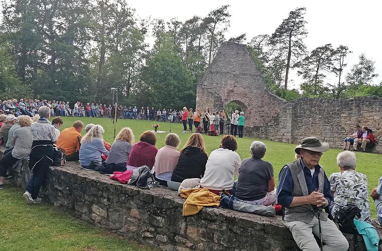Die Bergzeit auf dem Michelsberg ist längst keine lokale Andacht mehr für die Bevölkerung aus Reichenbach, Burghausen oder Münnerstadt. Zwischenzeitlich kommen Menschen aus der gesamten Region und aus zwei Landkreisen zu der besonderen Andacht. Der jüngste Gottesdienst an der Kirchenruine stand unter dem Motto "Freunde" und wurde gestaltet von der Veeh-Harfen-Gruppe der Lebenshilfewerkstatt Nüdlingen.