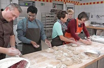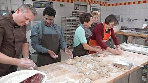 Bereits seit fünf Jahren stellt die Haundorfer Bäckerei Polster in der Fastenzeit ein Benefizbrot her, dessen Verkaufserlös zur Hälfte für einen guten Zweck gespendet wird. Heuer kommt das Geld der Herzogenauracher Ausgabestelle der Tafel zugute, deren Mitarbeiterinnen sich in Begleitung von Pater Ashok Antony Mathew von der katholischen Pfarreiengemeinschaft unlängst in der Backstube in Haundorf trafen, um unter der Anleitung von Dominik Sicker gemeinsam Benefizbrote zu backen.