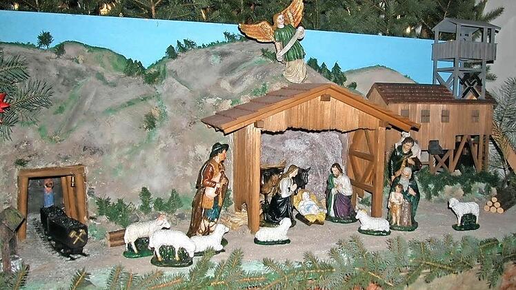 Die hohe Zeit für Bastler ist gekommen, wenn die langen Winterabende anbrechen. Dann bietet sich denen, die ihre Hände geschickt zu gebrauchen wissen, besonders ein Motiv an: der Stall von Bethlehem mit der Krippe. Zum Kreis der begnadeten Bastler zählt der Stockheimer Hubert Busse, der in mühevoller Arbeit - mit Unterstützung von Joseph Rebhan - eine bergmännische Krippe angefertigt hat, die im katholischen Gotteshauses St. Wolfgang zu weihnachtlicher Zeit bewundert werden kann. Links zu sehen sind ein Stollen mit Stempel und Kappen, zwei Transporthunte mit echter Stockheimer Steinkohle sowie rechts der Förderturm der Katharinazeche von 1960. Das Kunstwerk ist zwei Meter breit und einen Meter hoch. Foto: G. Fleischmann