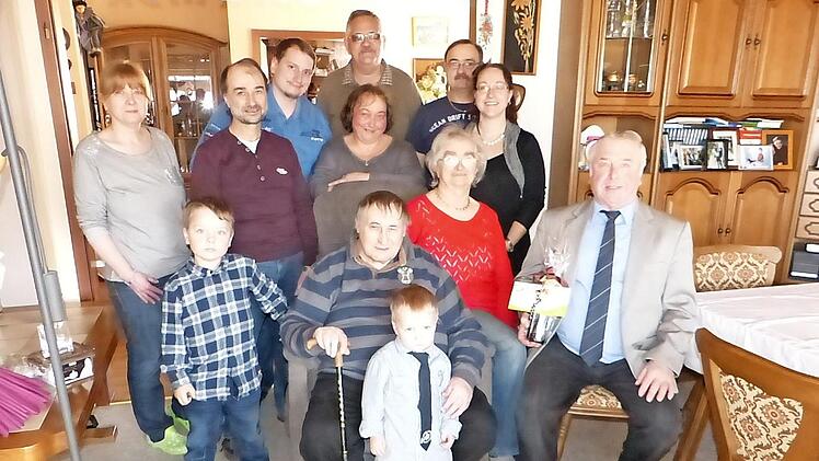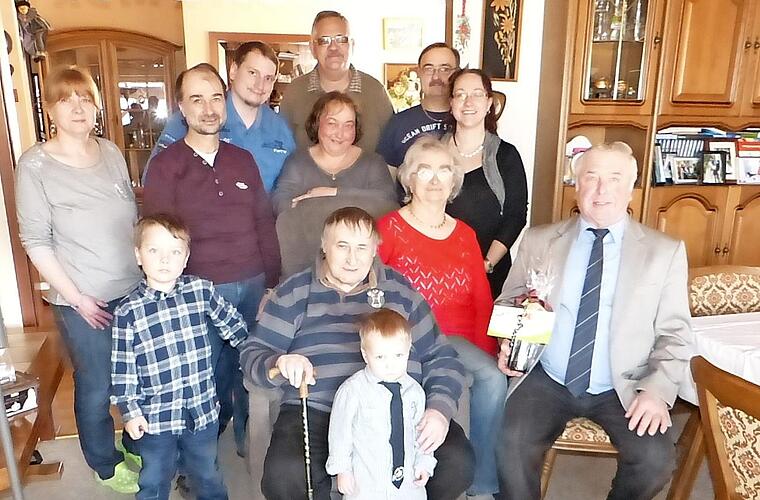 Viele Hände durfte Bertold Teig in Rugendorf an seinem 80. Geburtstages schütteln. Teig ist in Grafendobrach geboren, aufgewaschen und zur Schule gegangen. Seine Frau Burgel hat er im Kino kennen und lieben gelernt. Sie schenkte ihm drei Kinder. Das Familienglück machen drei Enkel und zwei Urenkel perfekt. Zu den Gratulanten zählten Pfarrerin Sigrun Wagner, Zweiter Bürgermeister Fritz Rösch und eine Abordnung des TTC Rugendorf. Foto: Klaus-Peter Wulf