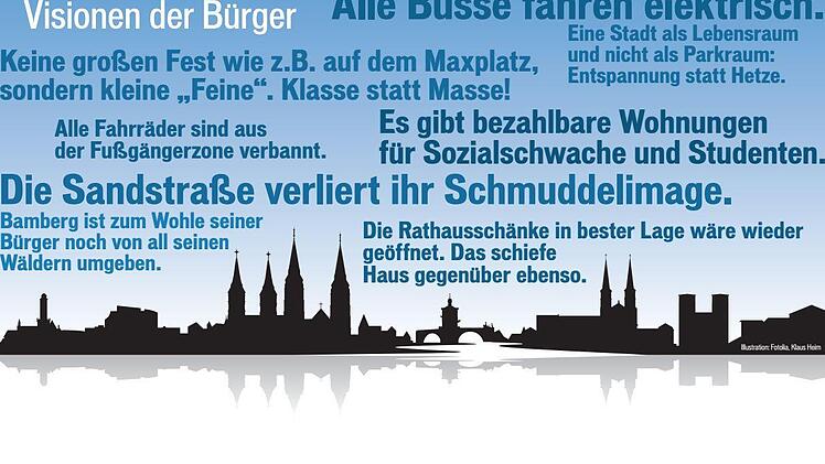 Genau das war die Idee bei einer Ausstellung im Foyer des Bamberger Rathauses. Dort wurden die Besucher ganz ohne Denkverbote gefragt: Was sind Ihre Ideen und Wünsche für Bamberg im Jahr 2050? Und die Antworten waren erstaunlich und vielschichtig, auch wenn sie sich stark an aktuellen Problemlagen orientierten. So schlägt ein Bürger unter dem Stichwort "Klasse statt Masse" vor, auf große Feste zu verzichten und stattdessen kleine, feine Feste zu etablieren. Ganz konkret wünscht er sich "ein Hainparkfest oder Konzerte in kleinerem Rahmen". Ein anderer möchte die "Stadt als Lebensraum und nicht als Parkraum" erleben, in dem es Entspannung statt Hetze gibt. Die Umsetzung stellt er sich in Form von Urban Gardening im Straßenraum und auf ehemaligen Parkplätzen vor. Es soll nur noch ÖPNV geben und autonome E-Car-on-Demand, dazu Kunst-, Kultur- und Kommunikationsräume.