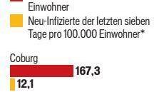 Sobald innerhalb von sieben Tagen mehr als 50 von 100 000 Einwohnern Corona-positiv getestet werden, müssen die betroffenen Landkreise Maßnahmen ergreifen. Beim Landkreis Coburg mit seinen 86 906 Einwohnern wäre das ab dem 44. Infizierten der Fall. Ausweislich der vom Landkreis veröffentlichten Statistik stieg die Zahl der Infizierten seit Donnerstag vor einer Woche bis zum gestrigen Donnerstag um 53. (Die vom Robert-Koch-Institut veröffentlichte Inzidenzzahl von 58,7 ergibt einen Anstieg um 51). Hinzu kommt ein weiterer Corona-Toter. Deren Zahl liegt nun bei zwölf.