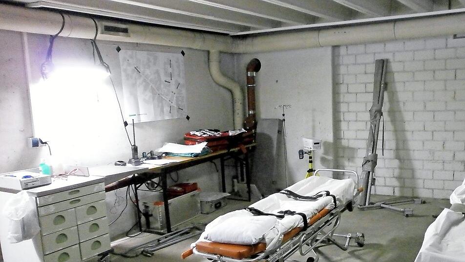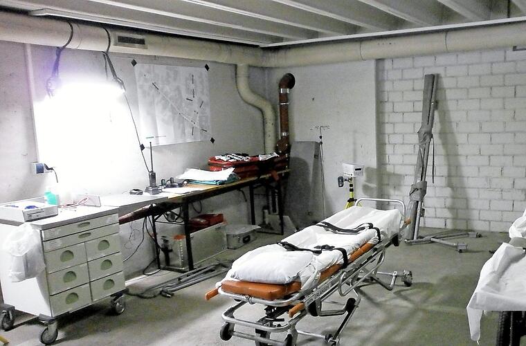 Zunächst sieht man nur den Eingang zum Biergarten und den Ausschank, der sich in der alten Polizei-Garage unter der Schloss-Terrasse befindet. Abgetrennt vom Ausschank findet sich im linken Bereich des Kellers eine komplett eingerichtete Sanitätsstation. Von der Krankentrage, über einen Verbandswagen bis hin zu hochmodernen Überwachungsmonitoren und zur mobilen Ausrüstung für Rettungstrupps ist alles vorhanden.