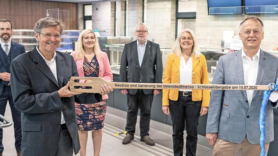 Zu einer gemeinsamen Besichtigung mit feierlicher Schlüsselübergabe trafen sich jetzt Melanie Huml, bayerische Staatsministerin für Gesundheit und Pflege, der amtierende Universitätspräsident Prof. Godehard Ruppert, sein künftiger Nachfolger Prof. Kai Fischbach, Kanzlerin Dagmar Steuer-Flieser, Jürgen König, Leiter des Staatlichen Bauamts Bamberg, und Michael Ullrich, Geschäftsführer des Studentenwerks Würzburg.