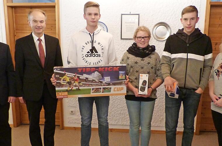 Nico Burger aus Hohenberg und Paulina Maier aus Kupferberg gewannen je einen Bluetooth-Lautsprecher, und Fabian Rausch aus Marktleugast freute sich über ein TipKiK-Fußballspiel. Alle drei bedankten sich bei der Raiffeisenbank dafür. Vorstandsvorsitzender Ralph Goller wünschte den Preisträgern viel Spaß und Freude mit ihrem Gewinn und natürlich jedem den richtigen Ausbildungsplatz, der viel Spaß machen soll. Klaus-Peter Wulf