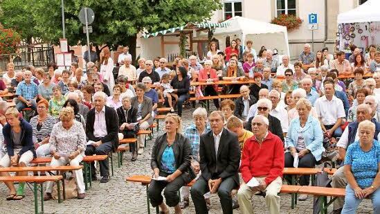 Das Spätsommerfest begann mit einem Freiluftgottesdienst direkt vor der Stadtpfarrkirche, den Pfarrer Mark Odah hielt. Bürgermeister Michael Ziegler und die beiden Vorsitzenden Krönert und Stark-Heil eröffneten dann das Markttreiben - just, als der Himmel seine Schleusen öffnete. Zum Glück standen die Türen der Stadthalle offen, so dass man zum Mittagessen dorthin ausweichen konnte. Dort wurden Spanferkel und andere Spezialitäten serviert.
