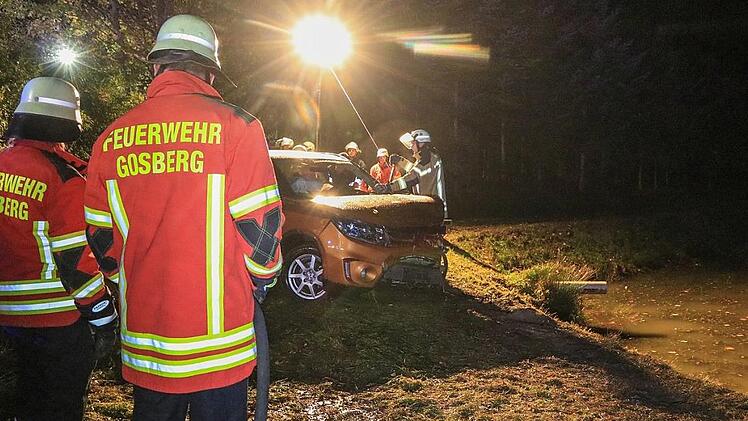 Nach einer Kollision zweier Fahrzeuge am Freitagabend landete ein Auto in einem Fischweiher: Auf der Straße zwischen dem Kersbacher Kreisel und Gosberg kam es zu einer Vorfahrtsmissachtung und in der Folge zu einer Kollision, nach der ein BMW bei der Abzweigung nach Kersbach auf Höhe der Mülldeponie von der Straße abkam, durch eine Hecke schoss und mit der Fahrzeugfront in einem Fischweiher landete. Die Einsatzkräfte der Feuerwehr sicherten den BMW zunächst mit einer Seilwinde, bevor sie diesen aus dem Weiher ziehen konnten. Der Fahrers musste so lange im Fahrzeug ausharren, da eine andere Rettung nicht möglich war. "Das Gute dabei war, dass die Person, die eingeschlossen war, nicht lebensgefährlich verletzt war, so dass wir für die Maßnahmen ausreichend Zeit hatten", erklärte Timo Sokol von der Feuerwehr Forchheim. Bei dem zweiten beteiligten Fahrzeug musste eine schonende Rettung des Fahrzeuginsassen stattfinden. Die Feuerwehr entfernte das Dach mit schwerem hydraulischen Rettungsgerät. Beide Fahrer wurden vom Rettungsdienst behandelt und in ein Krankenhaus gebracht. Neben Polizei und Rettungsdienst waren rund 50 Feuerwehrleute aus Forchheim, Gosberg und Kersbach im Einsatz. Foto: News5 / Merzbach