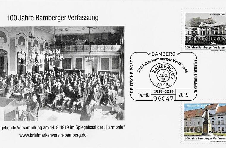 Aufgrund dieses 100. Jubiläums der "Bamberger Verfassung" hatte der Briefmarken- und Münzsammlerverein Bamberg e. V. bereits vor eineinhalb Jahren beschlossen, zwei Sonderbriefmarken als Individual-Marken, einen Sonderumschlag und einen Sonderstempel anzufertigen. Die Briefmarken zeigen einmal die Außenansicht der Harmonie von 1919 und einmal die heutige Ansicht der Harmonie. Auf dem Umschlag ist die Innenansicht des Harmoniesaales mit den Landtagsabgeordneten während einer Sitzung zu sehen.