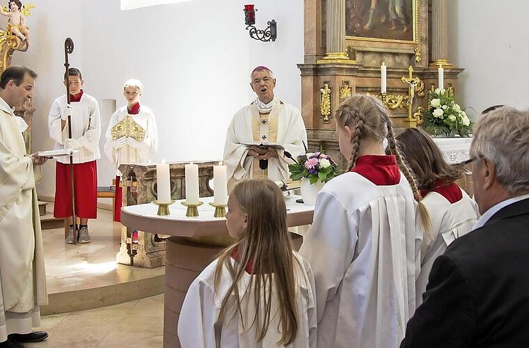 Nach dem feierlichen Einzug des Bischofs in die Wallfahrtskapelle, der von der Blaskapelle